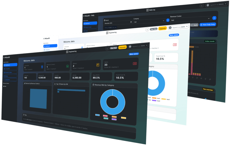 PhiloxOS is the company behind a focused hospitality platform: three tightly connected modules that keep your food & beverage data consistent from ingredient to guest-facing buffet card.
