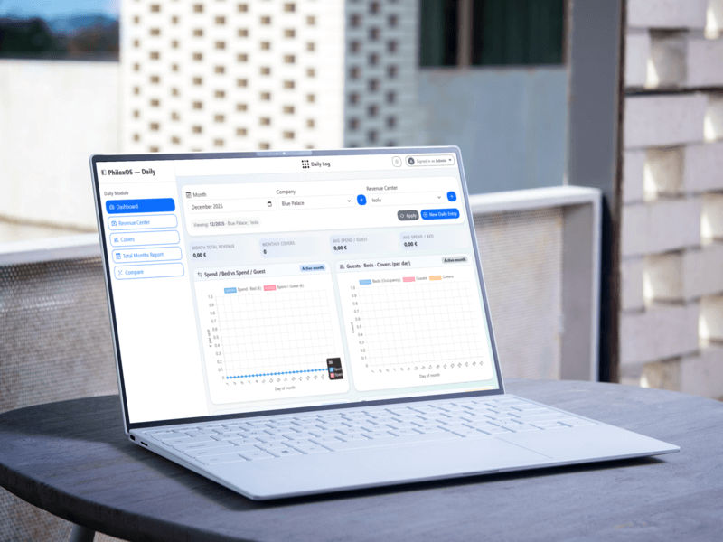 Each day you enter a simple log: guests, covers, revenue and comments. PhiloxOS turns this into charts and short summaries you can read in seconds.